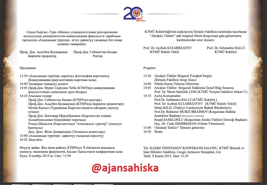 Kırgızistan-Türkiye Manas Üniversitesi Rektörlüğü Katkılarıyla İletişim Fakültesi tarafından hazırlanan: Ahıskalı Türkler adlı belgesel filmin Kırgizistan gala gösterimi olacaktır.